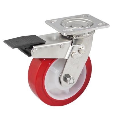 活动平底带分体全刹红色PU包白色PP不锈钢脚轮