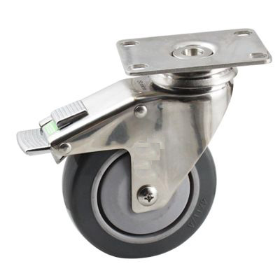 不锈钢活动平底带一体方向刹深灰色PU包灰色PP脚轮